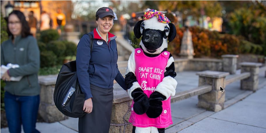 Rebekah Petrick stands next to the Chock-Fil-A mascot. Photo by Sydney Tevin